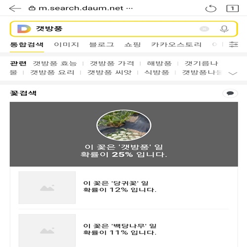 다음 앱의 검색 창 오른쪽에는 조그만 꽃 아이콘이 있는데요. 이 꽃 그림을 누른 후 나오는 옵션들 중 '꽃검색'을 누르면 기기의 카메라와 연동되고 화면 가득 꽃 그림이 보입니다. 이 그림에 맞추어 꽃의 정면을 찍은 후 대기하면 자동으로 검색 결과가 일치도, 비슷한 다른 꽃, 관련된 블로그 글들과 함께 보이게 됩니다. 다음 어플을 사용한 꽃검색 기능은 인터넷 사용이 서툰 사람들도 쉽게 이용할 수 있도록 눈에 띄는 그림과 친절한 설명을 제공한다는 장점이 있습니다. 검색한 꽃과 결과로 나온 꽃의 일치도를 퍼센트로 표기해주어 검색 결과에 신뢰가 가고 비슷하게 생긴 다른 꽃에 대한 정보를 알 수 있어 다양하게 활용 가능합니다.