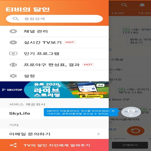 이외에도 생방송 중인 프로그램과 그러한 영상을 제공하는 홈페이지를 연결하여 사용자가 손쉽게 접근할 수 있도록 하고 있으며 각각의 카테고리를 세분화하여 깔끔한 인터페이스를 자랑합니다. 사용자가 편성표를 보지 않아도 직접 선호하는 프로그램을 찾아볼 수 있도록 화면 좌측의 메뉴 버튼에 실시간, 인기, 프로야구 분야 별로 채널을 분류해 놓아 취향대로 편리하게 시청할 수 있습니다. 채널이나 시간대가 한 눈에 보이기 때문에 사용이 익숙하지 않은 분들도 사용방법을 쉽게 익힐 수 있습니다.