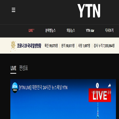 먼저 와이티엔 공식 홈페이지로 접속합니다. 와이티엔 공식 홈페이지에서 가장 먼저 뜨는 화면은 ‘홈’탭에 있는 다양한 최신 뉴스기사들인데요, ‘홈’탭 바로 우측에 위치한 ‘LIVE' 탭을 클릭하면 YTV korean, FTV, YTN 사이언스, YTN dmb, YTN news, YTN life 와 같은 다양한 YTN 채널들이 나오고 방영중인 뉴스들이 표시됩니다. 이때 시청하고자 하는 뉴스를 클릭하여 시청하면 됩니다.